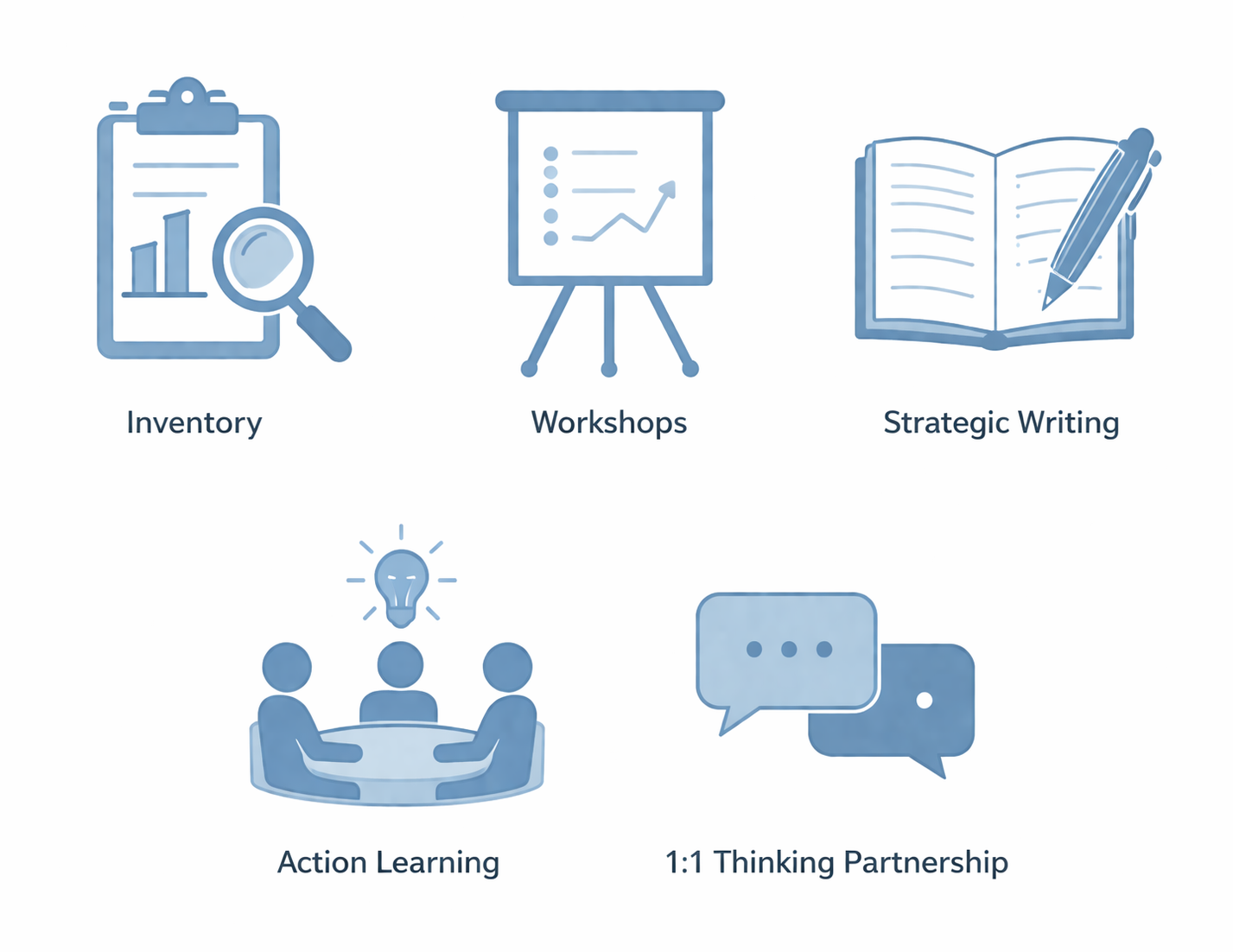 Through leadership workshops, strategic writing, action learning and one-to-one coaching, leaders move themselves into a more impactful narrative.