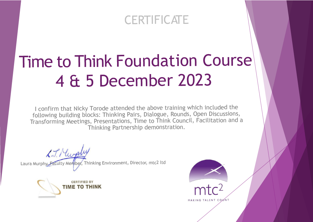 “Nicky, you are brilliant. You bring the best out of people – your gentle manner helps people to open up and share. Well-organised. Great visual aids.”